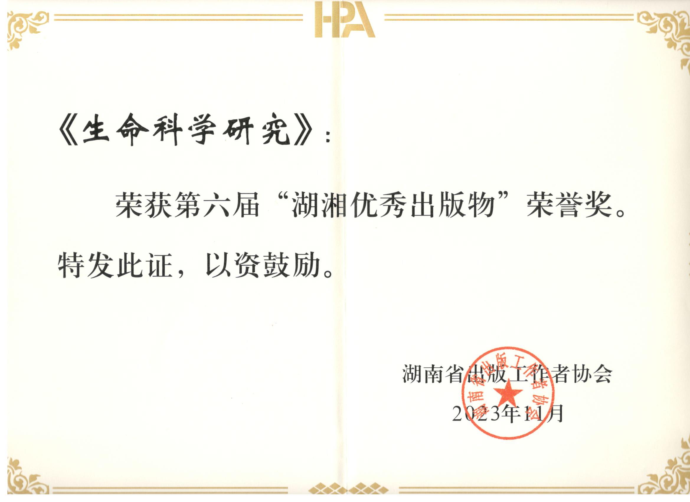 《生命科学研究》荣获第六届湖湘优秀出版物荣誉奖
