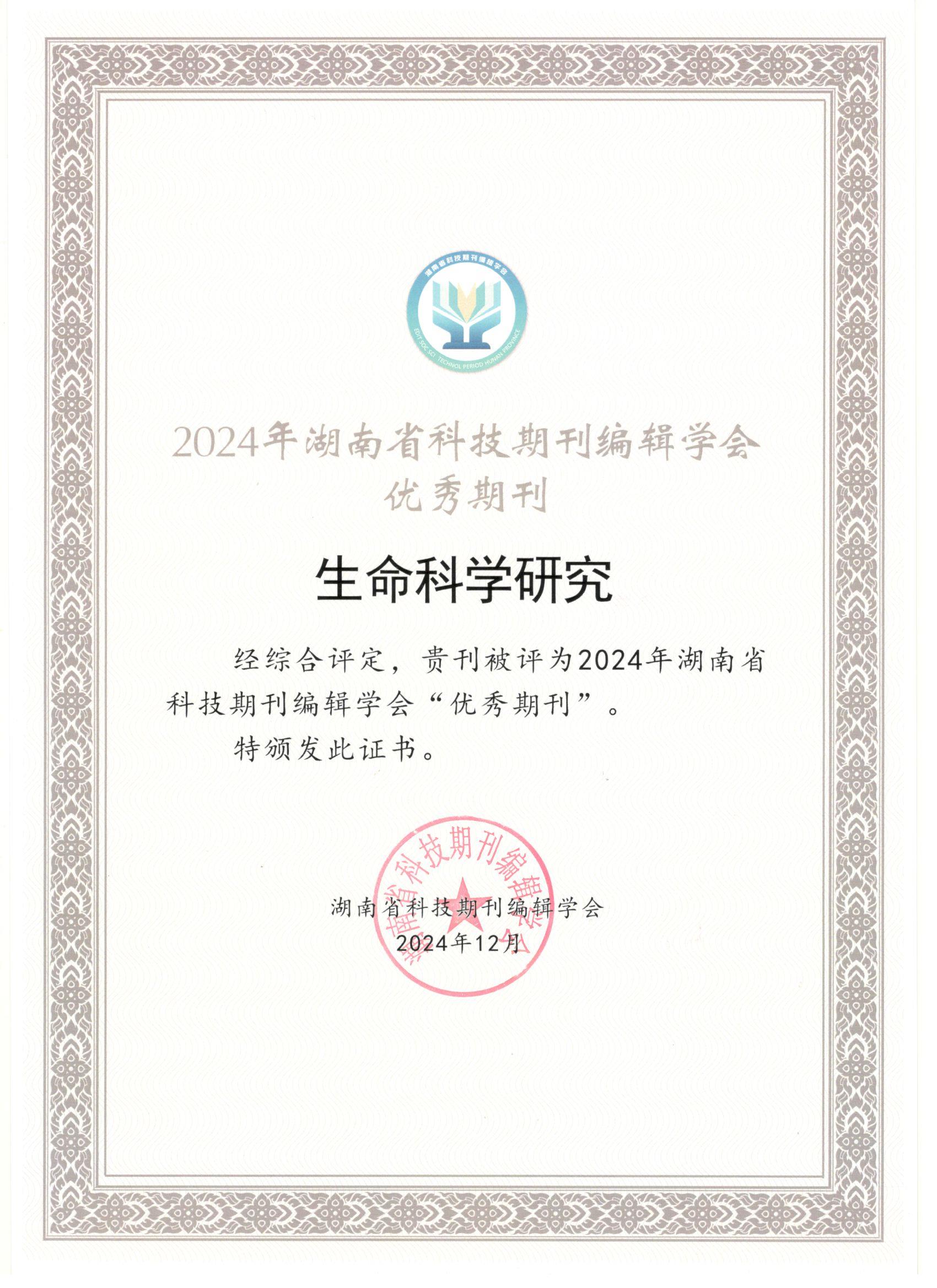 《生命科学研究》杂志荣获2024年湖南省科技期刊编辑学会“优秀期刊”