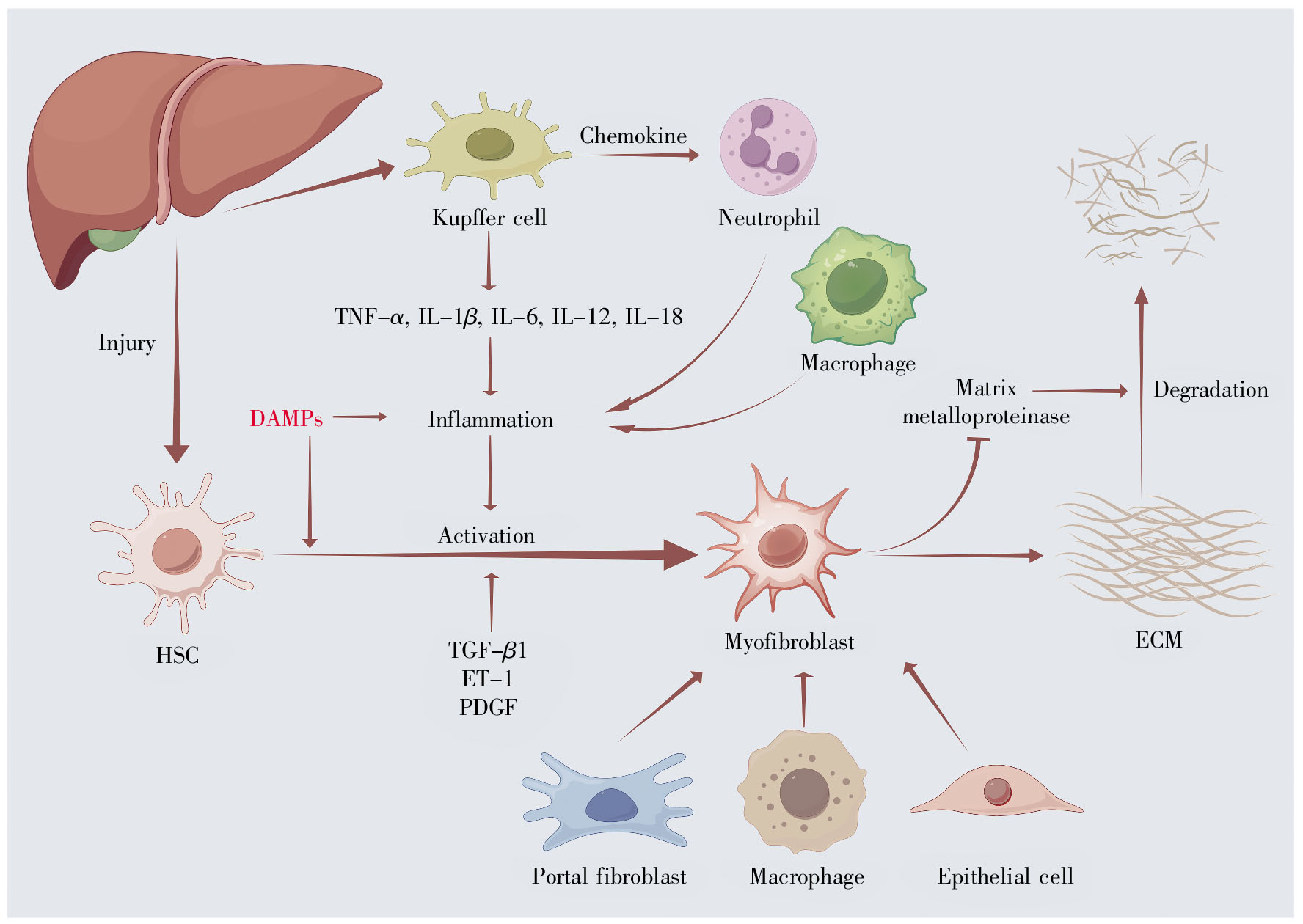 坏死性凋亡是一种区别于细胞坏死和凋亡的炎症性细胞死亡方式, 其发生受到细胞内分子机制的严格调控, 并具有坏死的形态学特征。肝纤维化是肝脏对各种慢性肝损伤进行自我修复的一种可逆性病理反应, 可进一步发展成为肝硬化甚至肝癌。近年来越来越多的研究表明, 坏死性凋亡引起的细胞损伤和炎症反应在促进肝纤维化中发挥重要作用。本综述介绍了坏死性凋亡的主要分子机制, 阐述了坏死性凋亡通过介导炎症反应促进肝纤维化发生发展的机制。